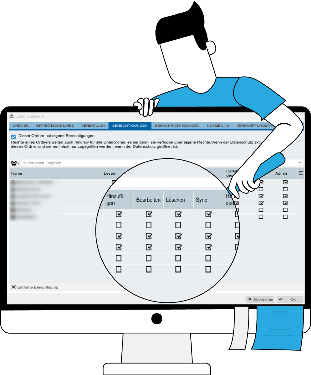 Insbesondere im Dateimanager gibt es noch weitere Möglichkeiten der Zugriffssteuerung. Lesen, Bearbeiten, Synchronisieren und Download sind für jeden Ordner für jeden Nutzer einzeln einstellbar.